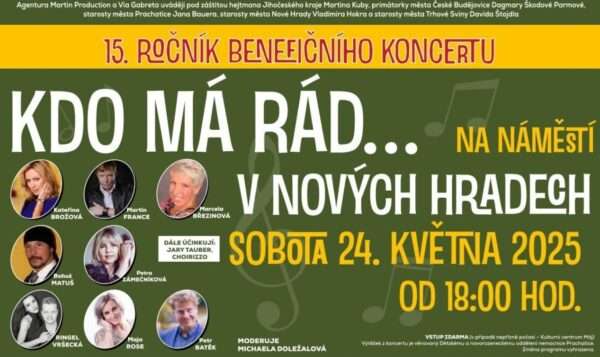 V aprílovém měsíci dubnu se uskutečnila v pražském Top Hotelu Praha tisková konference k již 15. ročníku benefičního koncertu „Kdo má rád…“, který se uskuteční v sobotu 24. května 2025 od 18.00 hodin pod záštitou jihočeského kraje a jeho hejtmana Martina Kuby a letos premiérově na náměstí v jihočeských Nových Hradech.