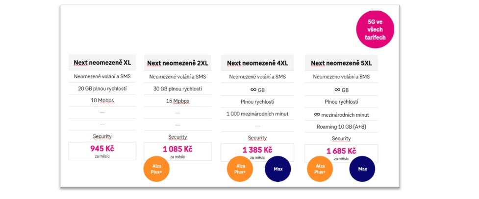 Nová tarifní řada Next nabízí různé výhody pro rozmanité zájmy uživatelů. Postavena je na neomezených datech na víkend, na dalších datových objemech doma i v zahraničí (i mimo EU), doplněna je o bezpečnostní složku Security, nechybí zvýhodněné telefony. Rozšířena je ještě i