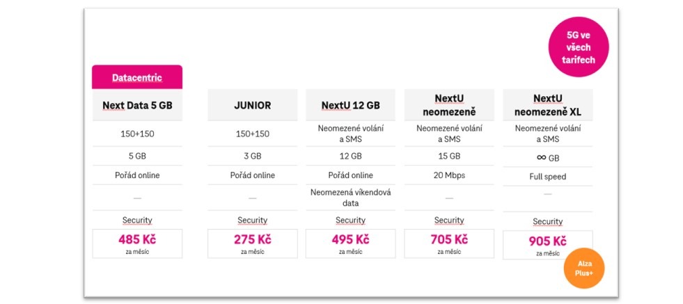 K vybraným tarifům řady Next si zájemci mohou zdarma na rok aktivovat některý z benefitů. Jedním z nich program AlzaPlus+, který nabízí doručení objednaného zboží na 25 000 výdejních míst po celé ČR. Navíc lze využít i exkluzivní AlzaPlus+ slevy na vybrané zboží. „Členství za 2 roky od spuštění vyzkoušelo 900 000 zákazníků. Všichni členové za tu dobu ušetřili dohromady přes půl miliardy korun a 96 % členů AlzaPlus+ doporučuje. Doprava zdarma platí na všechny nákupy doručené do AlzaBoxů, na pobočky či výdejní místa, bezminimální hodnoty objednávky, po celé ČR, klidně 100x za den,“ doplňuje Petra Sadílková, zastupující marketingová ředitelka Alza.cz.