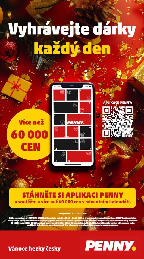 Od 1. do 24. prosince 2025 mohou uživatelé mobilní aplikace „PENNY“ denně otevírat jedno okénko v digitálním adventním kalendáři, ve kterém na ně čekají slevy, produkty zdarma či šance na slosování o dvacet pět dárkových karet v celkové hodnotě 250 000 Kč.