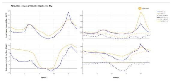 Mezi nejdražší hodiny patřila večerní špička ve 20 hodin a o víkendu o hodinu později. Medián ceny zde byl 161 EUR/MWh a o víkendu 123 EUR/MWh. Nejvyšší cena se vyšplhala až k 465,7 EUR/MWh, a to 1. července ve 20 hodin. Přitom minulý rok bylo maximum v červenci jen 260,8 EUR/MWh. O víkendu bývají i maximální ceny výrazně nižší. Letos to bylo jen 172 EUR/MWh. „Představa energeticky ‚levného víkendu‘ a ‚levného léta‘ ve srovnání se zimou a s pracovními hodinami je tak definitivně minulostí, v cenové mapě se naplno projevuje nová skladba zdrojů s vyšším podílem obnovitelných zdrojů, na kterou ještě současně česká energetika nedokázala úplně zareagovat, mj. se zpožděním (vlivem opožděné legislativy) nastupujícím trendem akumulace elektřiny,“ řekl Jan Palaščák, zakladatel skupiny Amper.