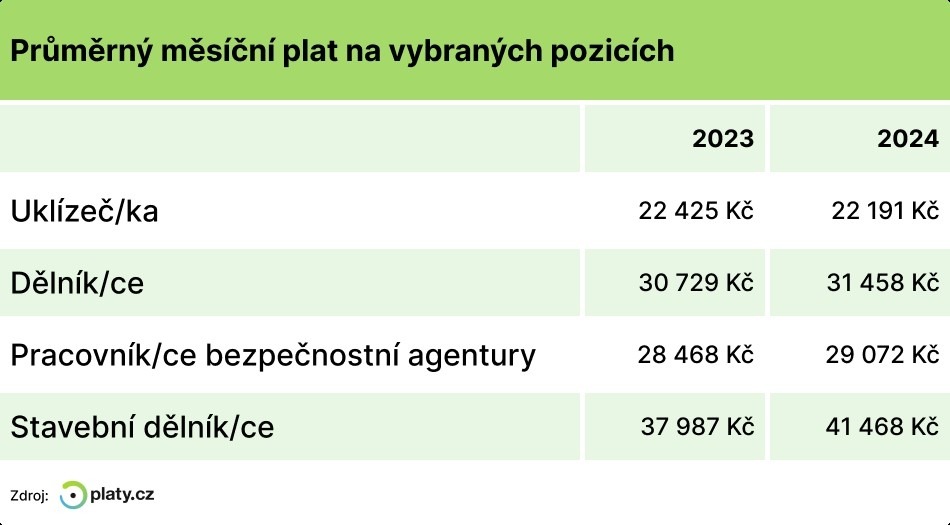 Na druhou stranu pracovníci na pozici uklízeč / uklízečka si meziročně lehce pohoršili o 1 % z 22 425 Kč na 22 191 Kč.