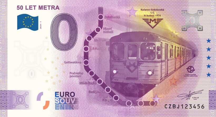Pražské metro letos slaví padesát let od spuštění první linky a kulaté výročí připomíná 0 euro suvenýrová bankovka, na které je vedle historické soupravy vyobrazen první úsek trasy „C“ včetně původních názvů stanic. „Počítáme, že o novou bankovku bude stejně velký zájem jako o 0 euro suvenýry věnované Karlu Gottovi, Jiřině Bohdalové nebo skupině Olympic,“ řekl ředitel veletrhu Jindřich Jirásek. Vášniví sběratelé čekají na nízká čísla bankovek, jež jdou do prodeje jako první, už několik hodin před otevřením veletrhu, někteří pak na místě často i nocují.