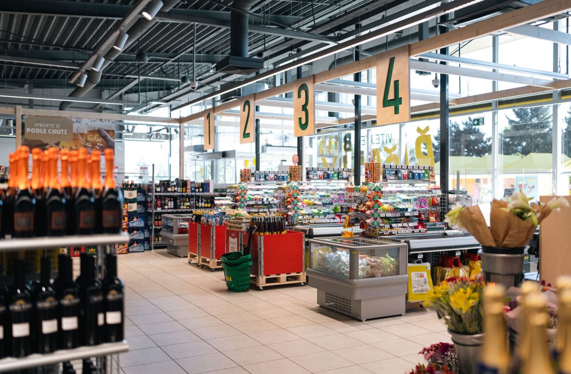 Design prodejny prošel výraznou změnou. Kombinuje osvědčené a moderní prvky, které dohromady ladí a vytváří příjemné prostředí pro nakupování. Dřevěné prvky v barvě břízy spolu s průchodnými uličkami mezi regály vzbuzují pocit vzdušnosti a zvětšené prodejní plochy.
