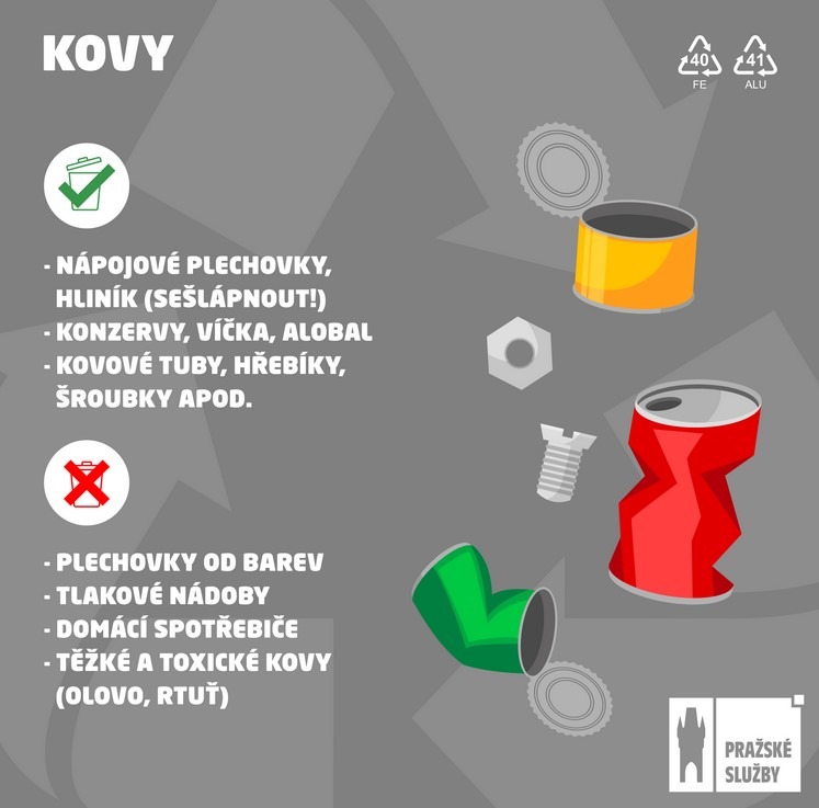 Do žádného z více než dvou tisíc šedých kontejnerů v ulicích nepatří poloprázdné tlakové nádoby, hořlavé spreje, kanystry ani obaly od motorových olejů a chemikálií. „Dále hasicí přístroje nebo plynové kartuše od turistických vařičů či zahradních grilů. Tyto produkty noste prokazatelně prázdné nejlépe do míst zpětného odběru,“ prosí Komarnický. Naopak můžete do popelnic na kov s klidným svědomím hodit sešlápnuté a vyprázdněné nápojové plechovky, konzervy, víčka, alobal, kovové tuby, kávové kapsle a tak podobně. Bezpečně vás o správnosti třídění ujistí recyklační symboly na obalech, shodné najdete i na řadě popelnic. Hledejte zkratky FE, případně ALU s čísly 40 nebo 41, uvnitř trojúhelníku ze šipek.