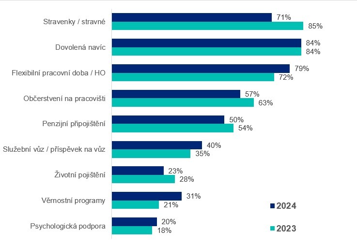 Pokles je dále u příspěvků na penzijní a životní pojištění, to poskytuje o 4 %, respektive 5 % společností méně než před rokem. Naopak více firem nabízí pracovní flexibilitu a možnost práce z domova (nárůst o 7 %).