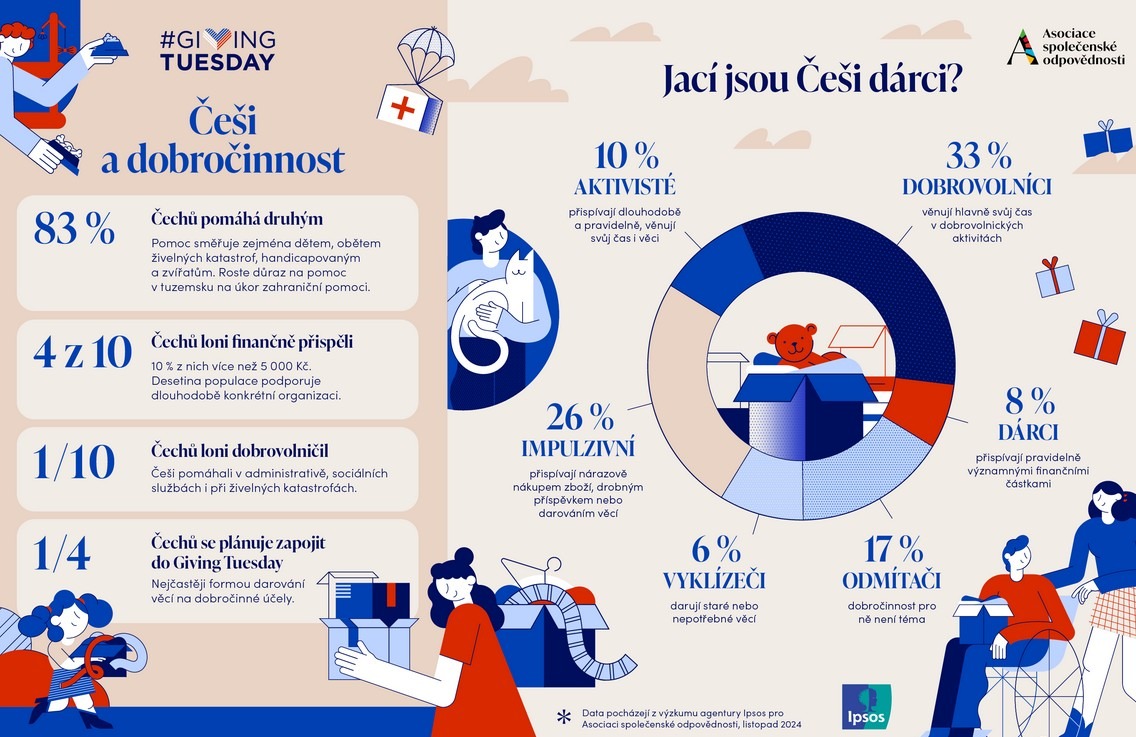 Black Friday se sice neúprosně blíží, nákupní horečka má ale stále silnější konkurenci. Tradiční celorepublikový výzkum agentury Ipsos pro Asociaci společenské odpovědnosti ukázal, že do světového svátku štědrosti a dobrých skutků se plánuje zapojit více než čtvrtina Čechů. Letos Giving Tuesday připadá na 3. prosince a vybízí k darování peněz, věcí nebo jiné pomoci nejen neziskovým organizacím místo tradičních nákupů.