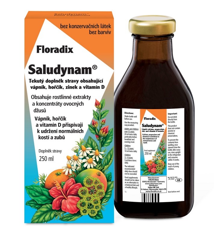 Velkou předností přípravků německé značky Salus, která má více než 100letou tradici, je komplexní složení. Tím se pyšní i tekutý doplněk stravy Salus Saludynam, který díky vitamínu D, hořčíku a vápníku působí hned trojí silou na udržení normálního stavu zubů a kostí a na správnou činnost svalů. Hořčík navíc přispívá ke snížení míry únavy a vyčerpání a zároveň příznivě působí na nervovou soustavu a psychiku. Pro náročné zimní období je tedy jako stvořený. Přípravek obsahuje také zinek, jenž podpoří vaši imunitu a podtrhne vaši krásu pružnou pokožkou, pevnými nehty a silnými vlasy. Významnou roli mají rovněž výtažky z bylin v čele s fenyklem, heřmánkem a ibiškem.