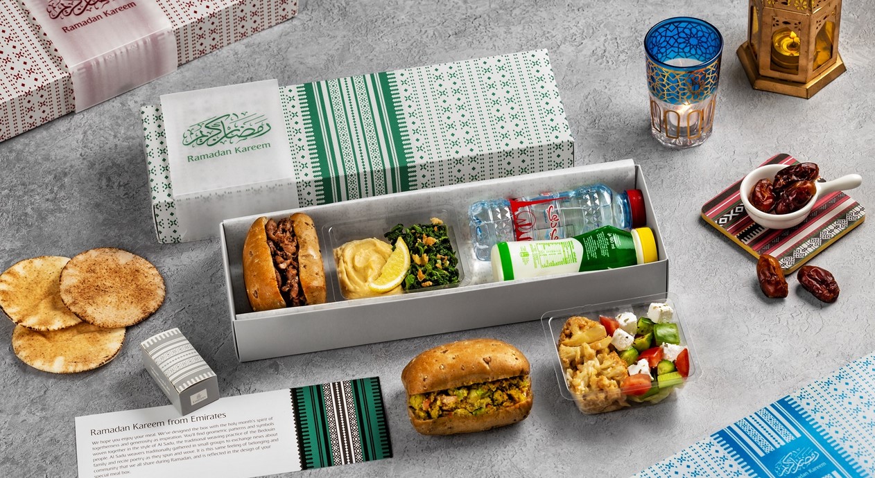 Od 11. března budou na vybraných destinacích zákazníkům nabízeny speciální ramadánové krabičky s jídlem ve všech palubních třídách. Jídlo iftar se bude podávat v krabičkách zdobených výraznými geometrickými vzory, které představují bohaté kulturní dědictví tkalců Al Sadu v emirátech, a odráží komunitní aspekt svatého měsíce. Krabičky obsahují lehká jídla od humusu se špenátem a arabským chlebem po tabbouleh (petrželový salát s bulgurem) a lilkový baba ghanoush, sendviče s kuřecím masem se zaatarem s majonézou z nakládaného česneku a sladké pochoutky jako mandle v čokoládě, klasickou baklavu, či baklavu s piniovými oříšky a oříšky kešu, datle a osvěžující laban. Tyto ramadánové boxy budou podávány jako doplněk k běžnému teplému jídlu.